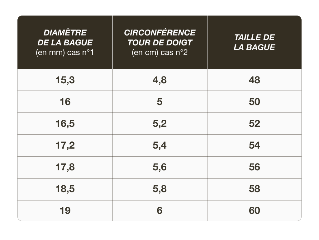 Vous pouvez mesurer le diamètre de la bague à l'aide d'une règle. Une fois la mesure prise, arrondissez au millimètre près et compare au tableau ci-dessous.