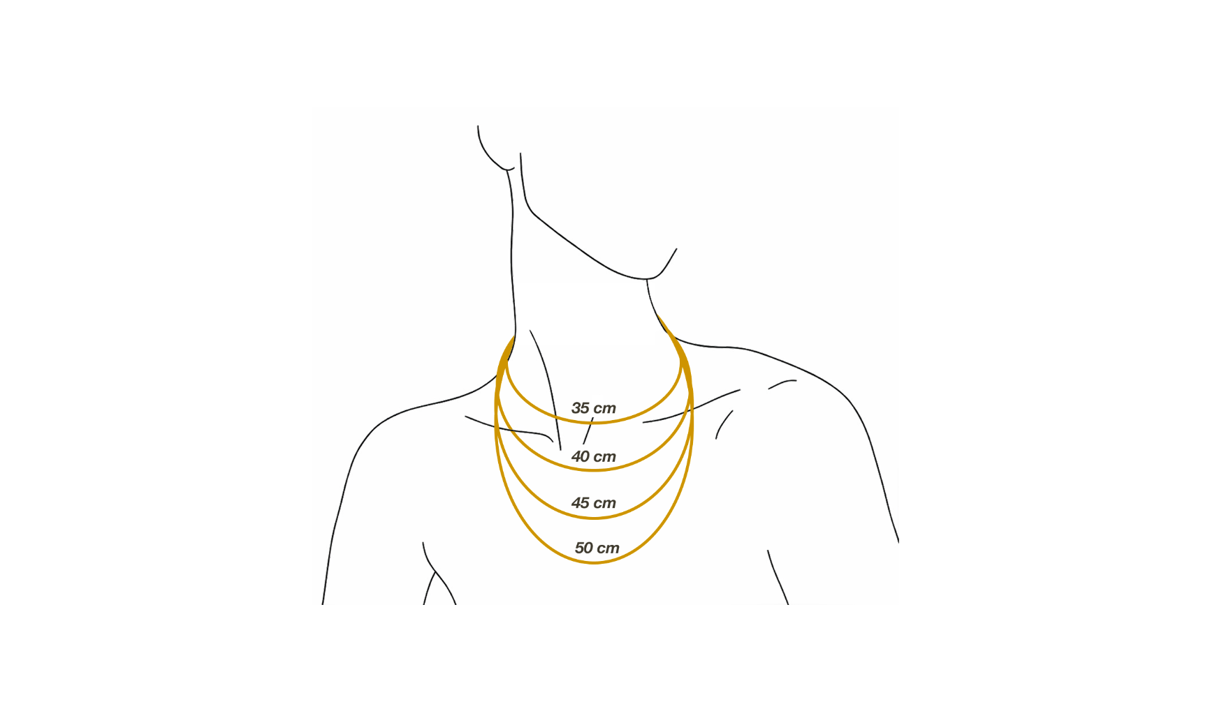 La plupart des colliers sont vendus avec une chaînette d'extension qui vous permet de rallonger le collier de quelques centimètres. Chaque taille de collier est indiquée dans la description du bijou. Vous pouvez vous aider du schéma ci-dessous pour visualiser la longueur sur le cou.